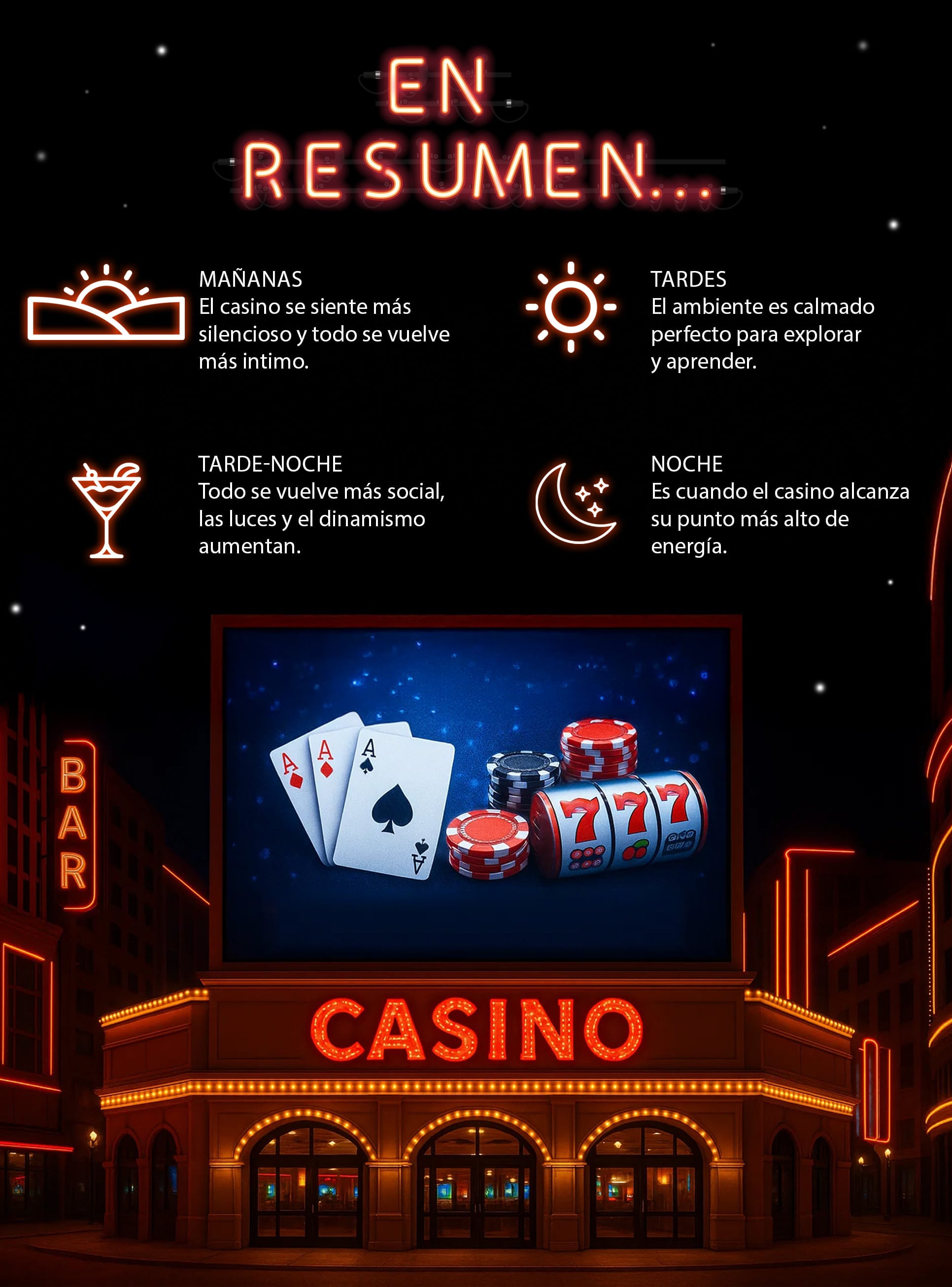La noche es cuando el casino alcanza su punto más alto de energía. Si te gusta sentir la adrenalina del piso, ver mesas activas, escuchar celebraciones y dejarte llevar por la vibra del lugar, este es tu horario.
